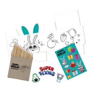 Be to, Bunny Ninja rinkinyje yra spalvoti pieštukai ir ant dėžutės atspausdinti paveikslėliai spalvinimui!