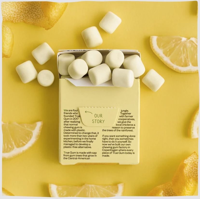 Ji saldi. Ji rūgšti. Ji be plastiko. Geriau nebūna. Išbandykite sultingą, gardų natūralios, augalinės kilmės True Gum citrininės kramtomosios gumos skonį. Augalinės kilmės.